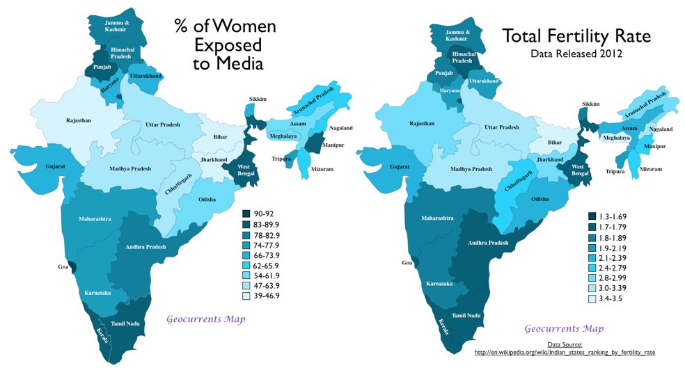 • Percentage of women exposed to media vs. Total Fertility Rate, 2012 (India)