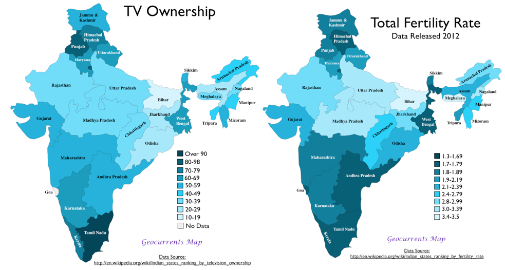 • TV ownership vs. Total Fertility Rate, 2012 (India)