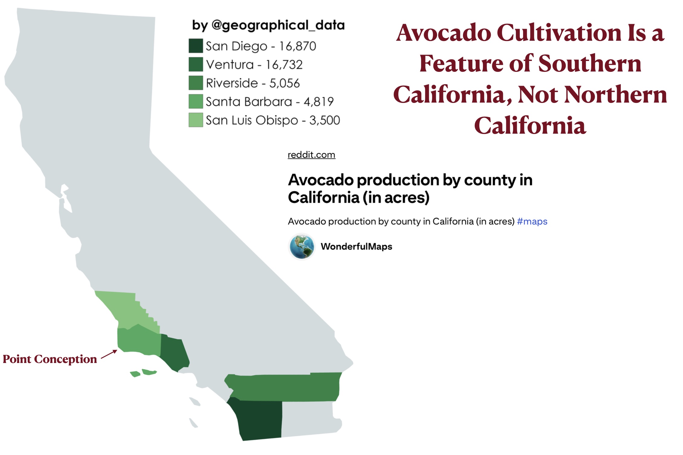 * As the map posted below shows, avocado orchards are found north of Point Conception in San Luis Obispo County, but I have never seen them.