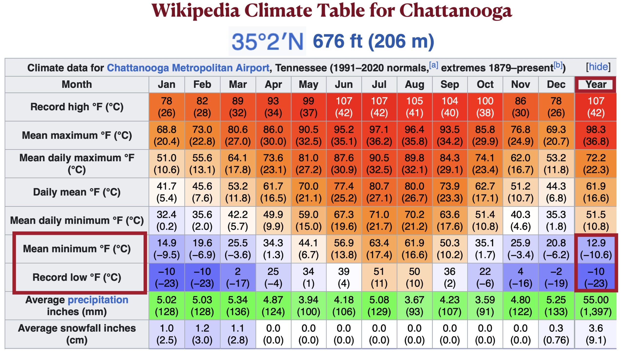 The Wikipedia article on the subtropics rests on more solid climatological grounds. It follows the Trewartha climate classification system in defining a subtropical climate as one “that has at least eight months with a mean temperature greater than 10 °C (50.0 °F) and at least one month with a mean temperature under 18 °C (64.4 °F).” The main problem with this definition is that it fails to exclude areas with short but chilly winters that have regular bouts of extreme cold – conditions that few people would regard as “subtropical.” Chattanooga, Tennessee, for example, easily slots into Trewartha’s humid subtropical zone, but its mean monthly minimum temperature in January is a frosty 15.9° F (-9.5° C) and its record low is a frigid -10° F (-23° C).