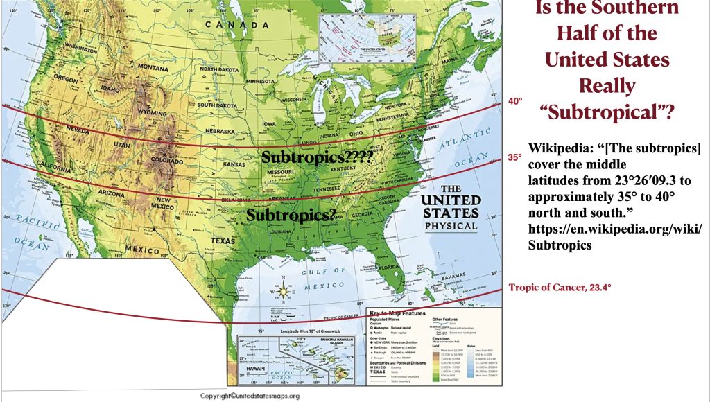 The previous GeoCurrents post harshly criticized several climate maps for extending the subtropical zones too far toward the poles. But after doing a little casual research, I was chagrined to discover that these maps largely fit the formal, or “geographical,” definition of the term. The Wikipedia article on the subtropics states that “they cover the middle latitudes from 23°26′09.3 to approximately 35° to 40° north and south.” Both ChatGPT and Grok give the same figures. But in the United States, the subtropics are seldom if ever imagined in such terms. The idea that Chattanooga, Tennessee (35°N) is subtropical, let alone Columbus, Ohio (40°N), would strike most Americans as absurd. It is also noteworthy that very few maps that purport to depict the subtropics follow this latitudinal definition – and for good reason.