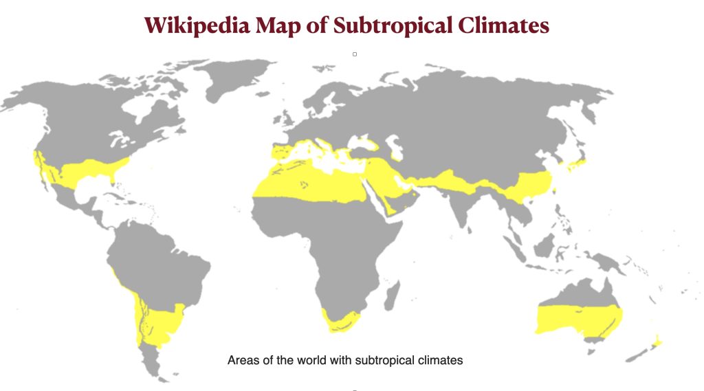 The main reason why the common conception of the subtropics does not match the formal definition is because the former is based on climate and climatic zones do not rigidly follow latitudinal belts. As can be seen below, the Wikipedia map of subtropical climates strays far from the lines of latitude that supposedly bound them. Although the Wikipedia article on the subtropics does not specify that the latitude-based definition of the term is quite different from the climatological definition, both ChatGPT and Grok do so. As a result, they give a better sense of what the term actually means.