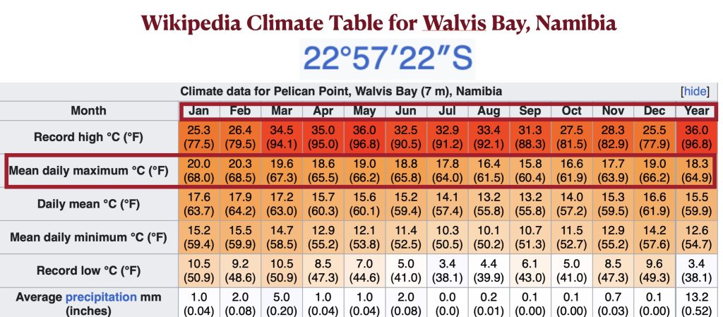 But even if we limit ourselves to the climatological subtropics, conceptual problems remain. To begin with, the definition of the term varies significantly from source to source. Such definitions, moreover, are often too vague to be useful. ChatGPT, for example, tells me that “Some meteorological sources define the subtropics as the region where [the] mean annual temperature is above 18°C (64°F) [and] winters are not cold enough for snow to be reliable,” but as this definition also includes the tropics. ChatGPT further claims that subtropical summers are hot, but that is not the case in many west-coast locations. In Walvis Bay, Namibia, which at 22°57’ is just north of the Tropic of Capricorn, not a single month has a mean daily maximum temperature above 68.5° F (20.3° C). Grok’s climatological definition of the subtropics, in contrast, is precise and seemingly scientific: “Regions where the average temperature of the coldest month is between 0–18 °C (32–64 °F) and the average temperature of the warmest month is above 22 °C (72 °F), following modified Köppen climate classification criteria.” But the “0–18 °C (32–64 °F)” coldest-month range is how the Köppen system defines temperate climates, not subtropical ones.