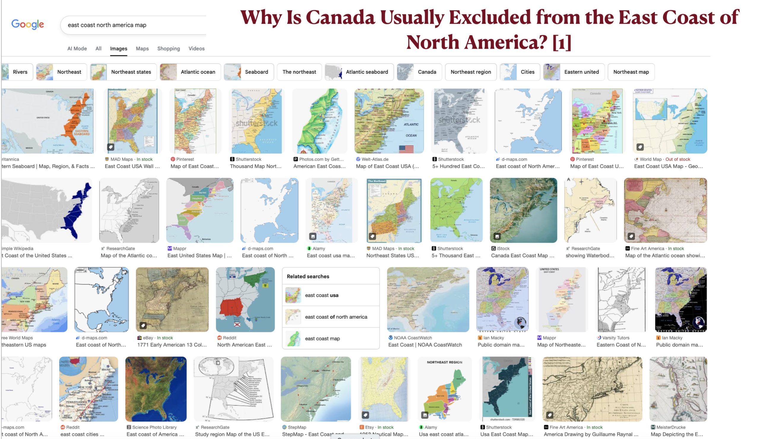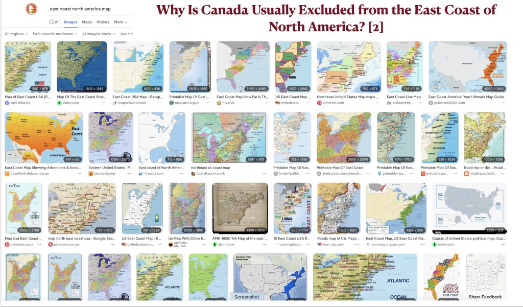 As a final note, I suspect that misunderstandings of the directional orientation of the eastern coast of North America stem not just from perceptual issues also from geopolitical considerations reflected in mapping conventions. Maps made in the U.S. usually terminate at the border, with relatively few showing the geographical relationship between the northeast United States and southeast Canada. As can be seen in the figures posted below, image searches for “east coast North America map” mostly return maps limited to the east coast of the United States. Most that include southeastern Canada, moreover, are simple outline maps with little content. We deserve better.
