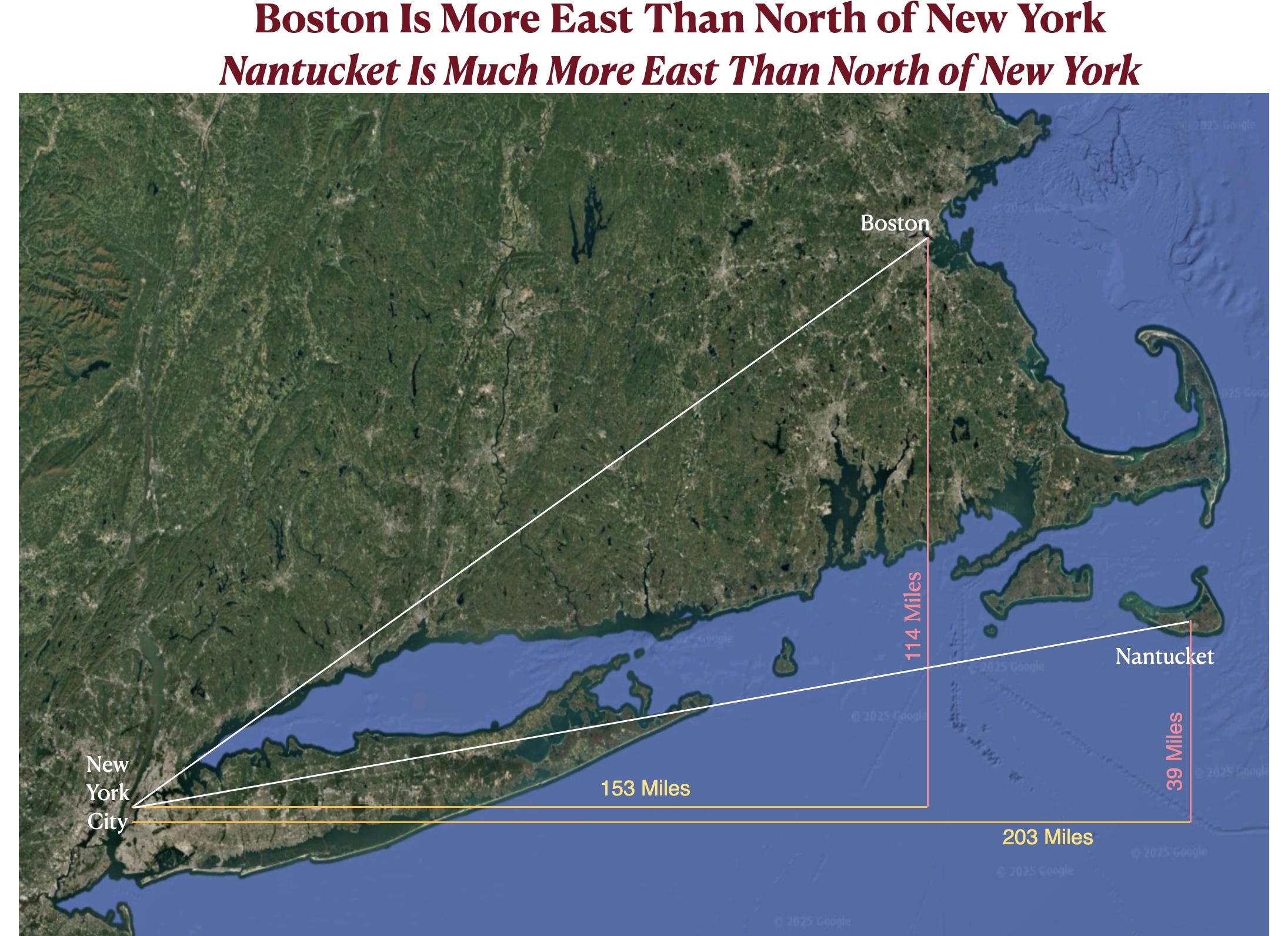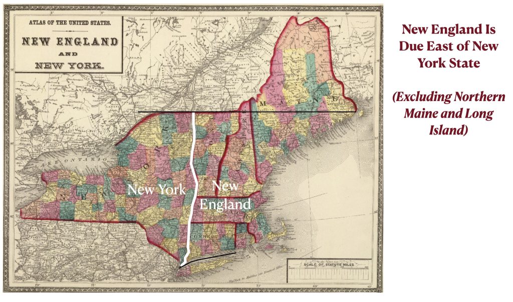 I had decided to move on from exploring the priority of north & south over east & west, but I realized that the most prominent example in the United States had escaped my attention: the northeast coast. Although this coast is often regarded as mostly oriented in a north/south direction, its actual orientation in more east to west. Boston, for example, is 114 miles north of New York City but 153 miles to its east. The situation is southeastern Massachusetts is more extreme. The town of Nantucket, for example, is 203 miles east of New York City but only 39 miles to its north. From New York to Cape Cod, the coastline runs almost west to east. Countering common expectations, moreover, New England is not north of New York state. If one excludes sparsely populated northern Maine and insular Long Island, New England is essentially due east of New York. While I imagine that this fact is widely understood locally, I have a strong suspicion that most Americans would find it surprising.