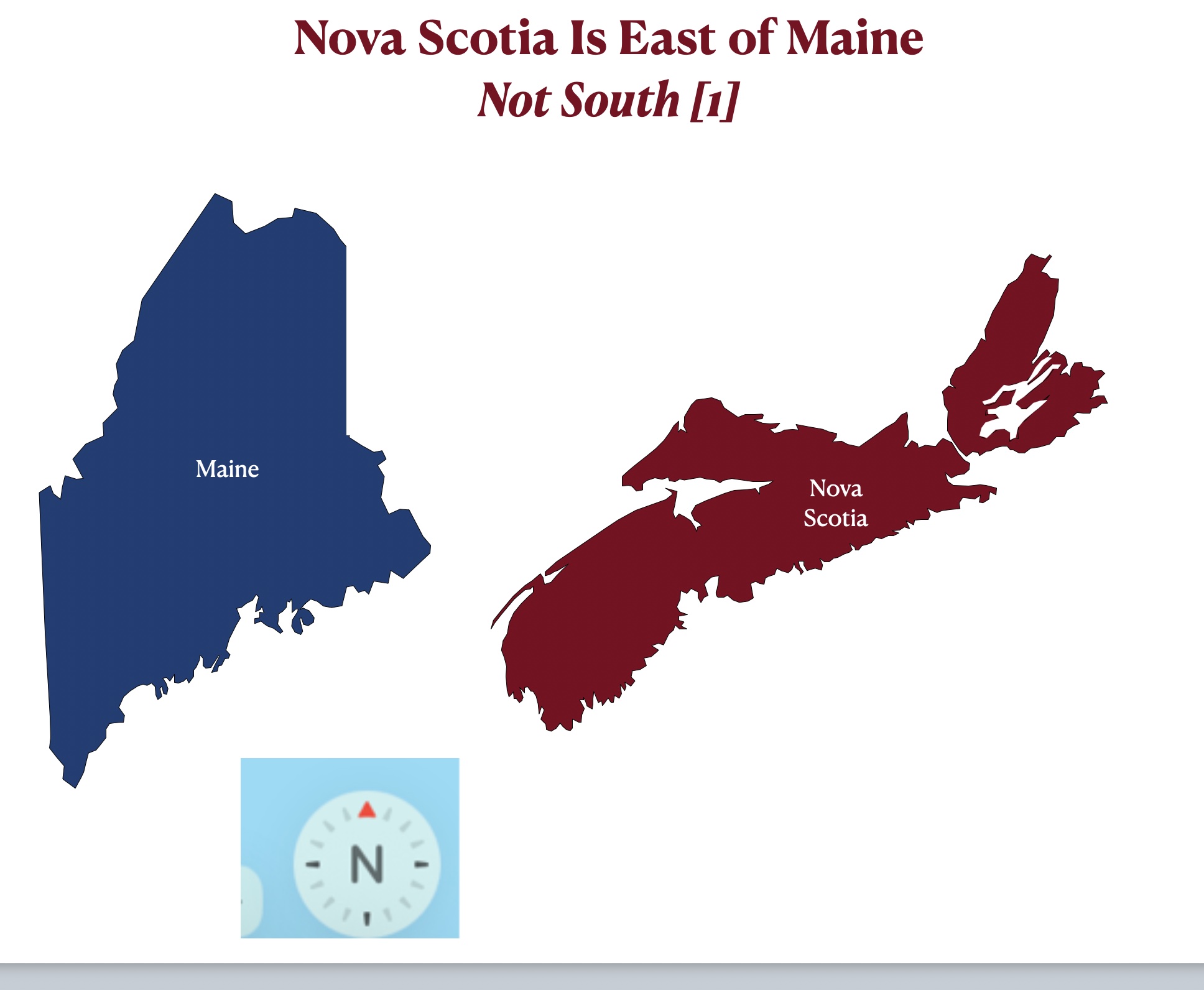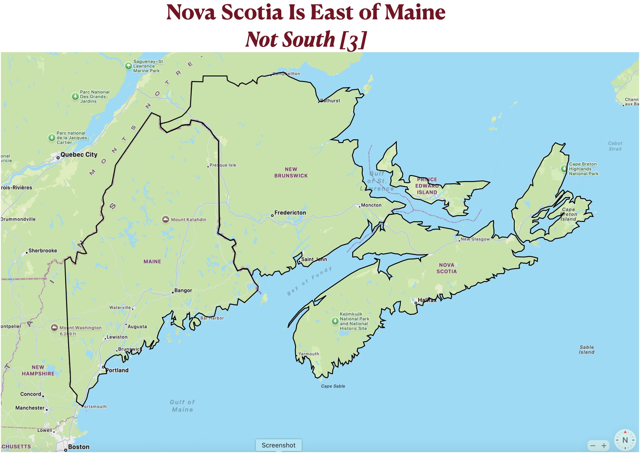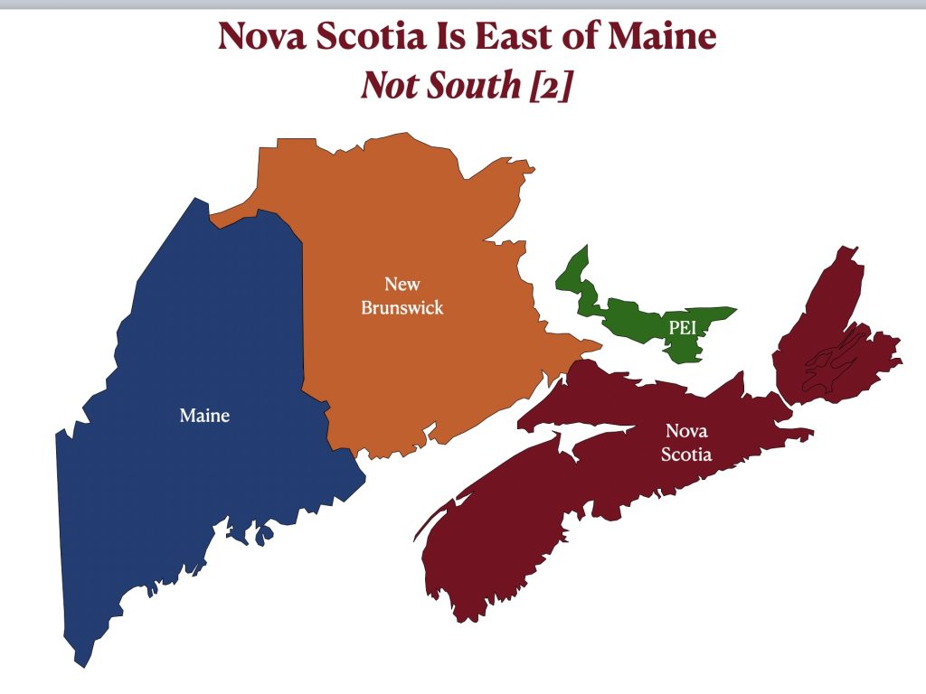 The misperception of Atlantic coastal orientation is heightened if one examines southeastern Canada together with northeastern U.S. together with. To the extent that Americans know about Nova Scotia, I think that it is safe to assume that most of them regard this Canadian province as located north of Maine. Actually, as can be seen in the map posted below, Nova Scotia is essentially due east of Maine. If this map appears to have misplaced these polities, examine the two maps posted below it, which reveal the larger regional context (and show how I made the first map).