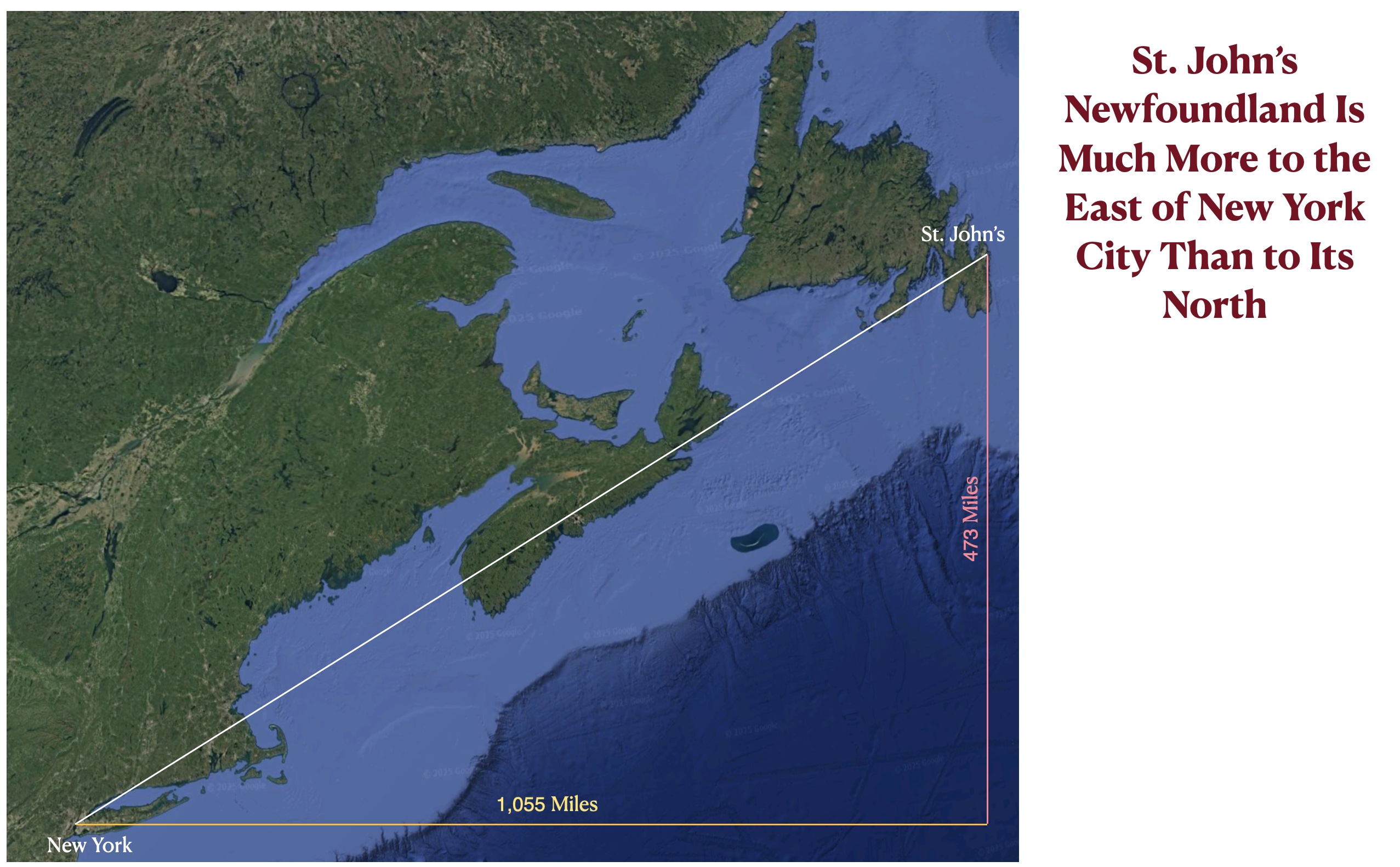 This east-northeast coastal orientation extends as far as the island of Newfoundland. As can be seen on the map posted below, St. John’s is only 473 miles north of New York but 1,055 miles to its east. It is also much closer to London (2,285 miles) than it is to Vancouver (3,125 miles).