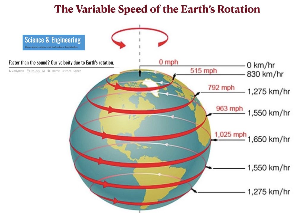 [2] At the equator, the rotational speed is about 1,040 mph, or 1,670 km/h.