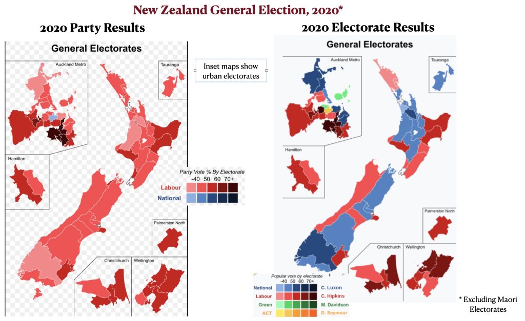 Before delving into geographical analysis of New Zealand’s recent elections, it is necessary to explain the complexities of the county’s “mixed-member proportional” parliamentary system. New Zealand is divided into 65 general “electorates” (geographical voting constituencies) and then redivided into seven special electorates for Māori voters. Each electorate selects one person to serve as its MP (Member of Parliament) in the unicameral parliament, officially known as the New Zealand House of Representatives. But Kiwi voters not only choose an individual to represent their electorate, but also vote a second time for a political party, each of which maintains a list of potential MPs. Parties whose total vote in that contest exceeds a certain threshold (usually five percent) send an additional 48* MPs into the House of Representatives, their numbers proportional to their share of the vote. Minor parties can thus gain parliamentary representation either by having enough voters concentrated in one or more electorate to defeat candidates from the other parties, or by having enough support nationwide to crack the five-percent threshold.