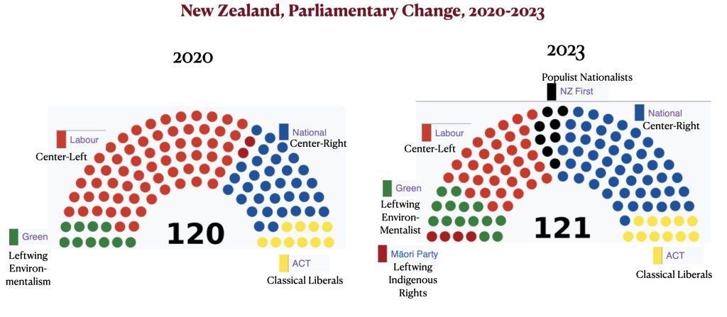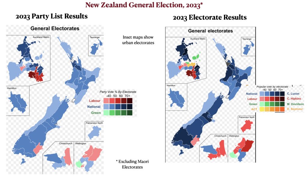 On October 14, 2023, however, New Zealand experienced a stunning electoral reversal. As the party-list vote maps for the two elections show, New Zealand went from almost entirely red (Labour) to almost entirely blue (National Party). Even on the more diverse Wikipedia map of the direct electorate results, there is little red to be seen in the country as a whole. But such mapping is misleading; as the inset maps show, the Labour and Green parties won quite a few urban seats, particularly in the country’s second and third largest cities, Christchurch and Wellington. But overall, the 2023 election was a clear triumph for conservatives. It was also a rout for Labour, which went from 62 to 34 seats in the House of Representatives. But the other left-leaning parties, the Greens and the Māori Party, gained seats. So too did the classically liberal ACT Party. The socially conservative nationalist-populist New Zealand First Party also did relatively well, returning to the House of Representatives after an absence of several years.