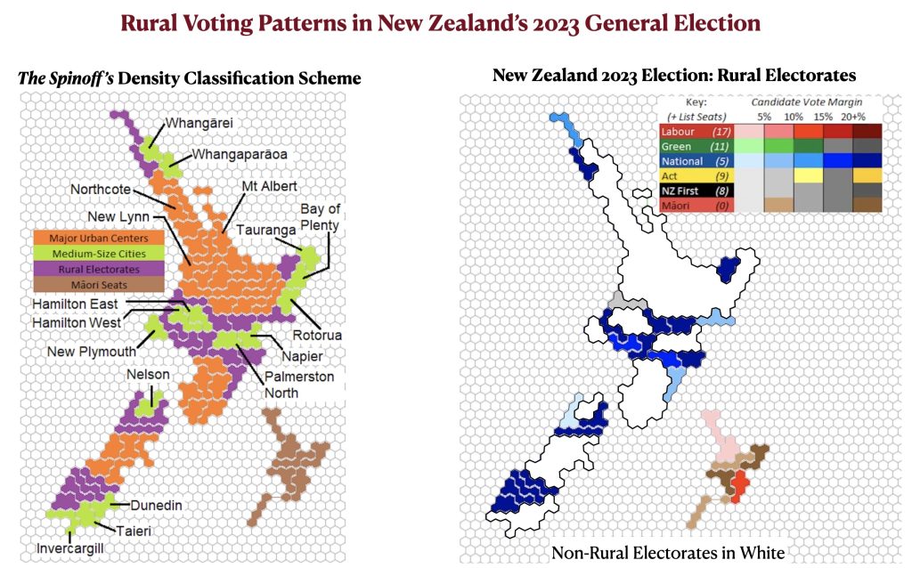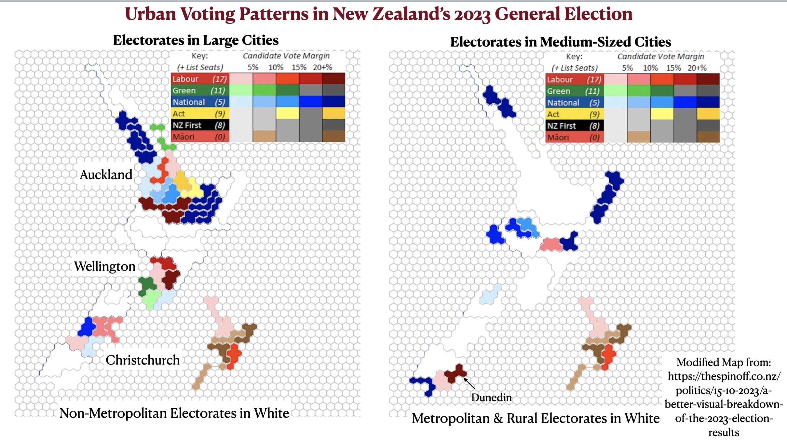 As conventional electoral maps give undue prominence to sparsely inhabited areas, and therefore tend to visually exaggerate the vote-share of conservative parties, electoral cartographers have devised more representative maps. The usual strategy is to expand more densely populated areas in proportion to their populations. For New Zealand’s 2023 election, The Spinoff devised such a map, converting the country into hexagons of roughly equal population. It also grouped the parties into two categories, one left-leaning and the other right-leaning. As can be seen in the resulting map, in the 2023 election New Zealand was still a mostly blue (conservative-voting) country, although not to the extent seen in conventional maps. This Spinoff map also clearly shows the Māori population, with its special electorates, as strongly supporting the political left.