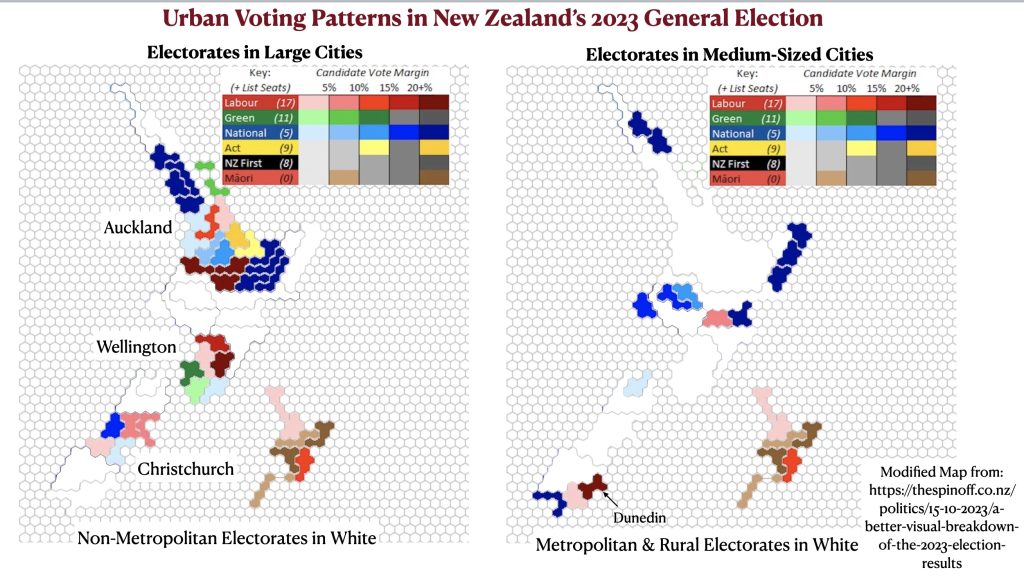 The Spinoff has drafted another map that divides New Zealand’s electoral hexagons into three categories, one composed of large cities (Auckland, Wellington, and Christchurch), one of medium-sized cities, and one of rural areas. Such mapping helps us see the role of population density in voting behavior. To clarify this situation, I have “whited-out” non-rural areas on one iteration of this map, everything but large cities on another, and everything but medium-sized cities on a third. As can be seen, rural electorates supported the conservative National Party, although some by relatively thin margins. Medium-sized cities delivered more mixed results, with some strongly favoring the National Party and others supporting Labour. Dunedin, in southeastern South Island, in particular leans left. Such affiliation is strongest in North Dunedin; as “Just Dave” comments in a Quora query about New Zealand’s most left-wing cities: