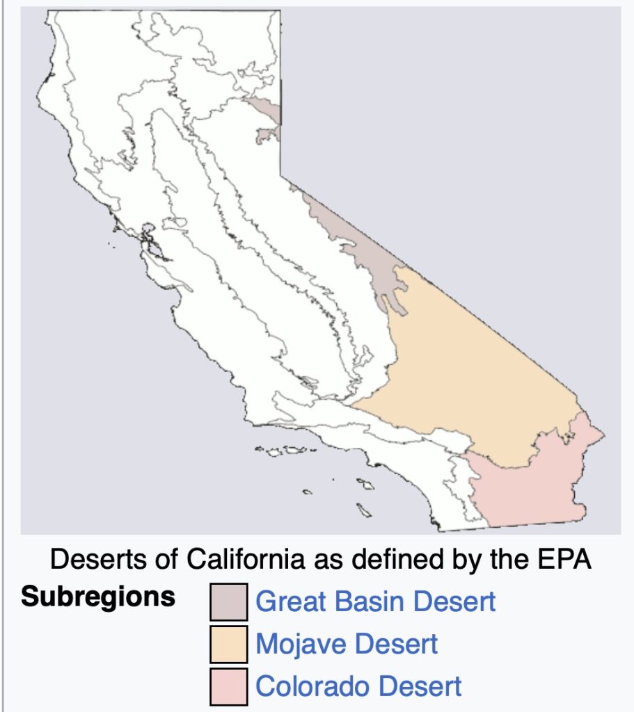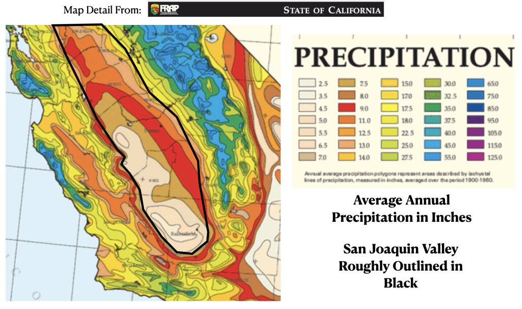 The southern half of California’s vast San Joaquin Valley is almost never depicted as a desert nor is it officially classified as one. But it clearly is a desert by climatological criteria. Most of the San Joaquin Valley gets less than 10 inches of precipitation a year, with much of the southern valley receiving less than seven, and it has an extremely high rate of evaporation from late spring through early autumn. But with abundant water flowing from the adjacent Sierra Nevada range, the southern San Joaquin Valley is a verdant, intensely cultivated land. Before the late 1800s, it was the site of the third largest freshwater lake entirely within the United States (as measured by surface area). But when the rivers that formerly flowed into Tulare Lake were diverted into canals to irrigate crops, the huge lake disappeared. Today, the former lakebed is highly productive farmland with only a few small seasonal wetlands providing natural habitat.