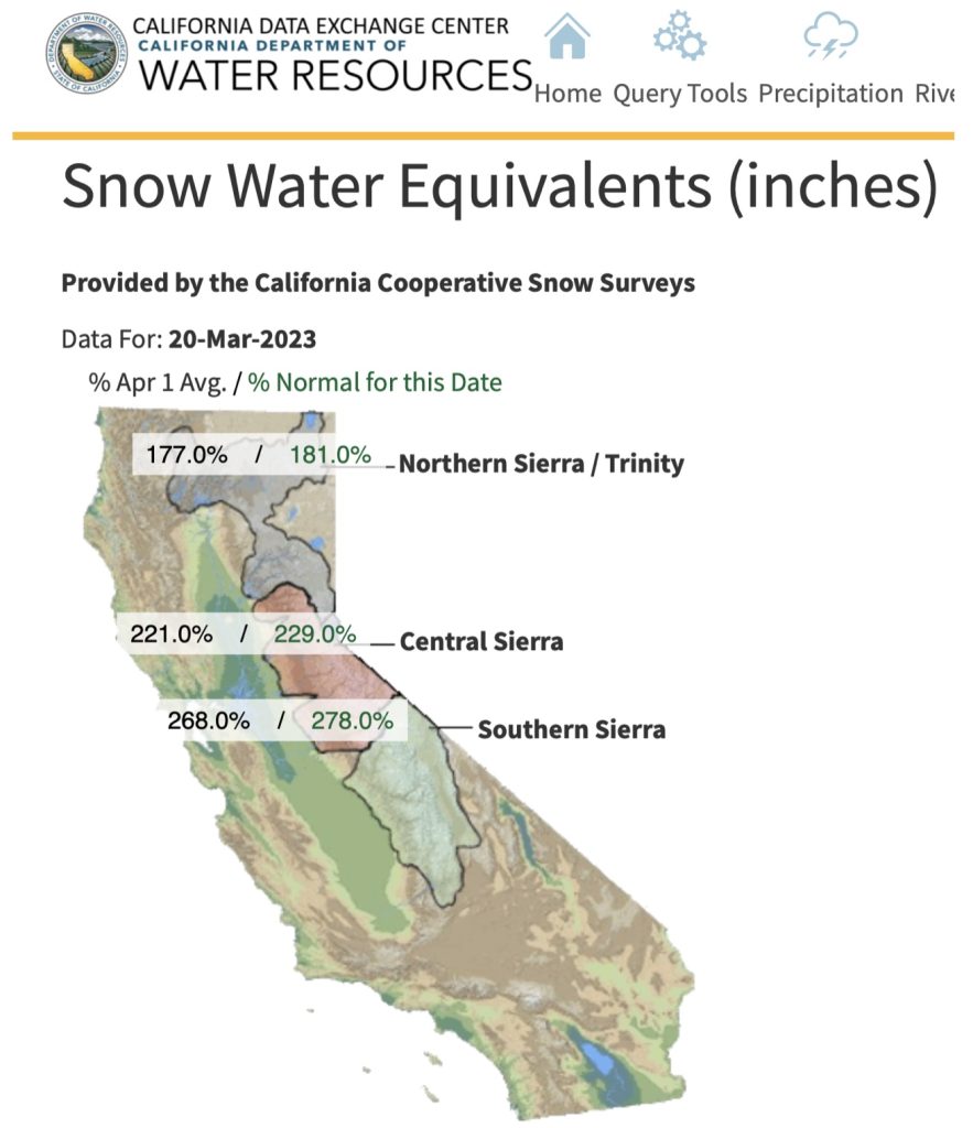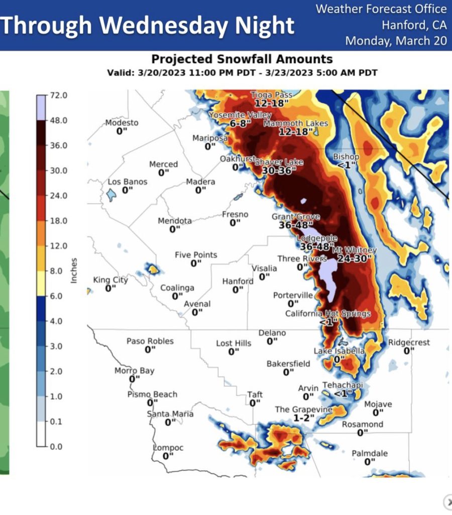 Another powerful storm is slated to slam into California on Tuesday, March 21. Like most of this year’s major storms, it will be most pronounced in central and southern California, largely missing the normally much-wetter northern third of the state. More than 48 inches of additional snow is expected in the southern Sierra, which drains into the Tulare Basin. Thus far this winter, the southern Sierra has received an astounding 268 percent of average annual snowfall.