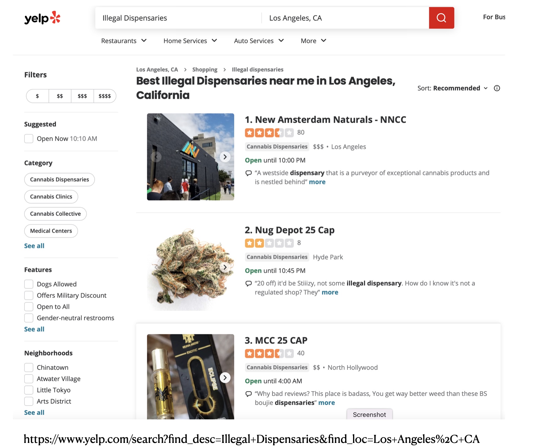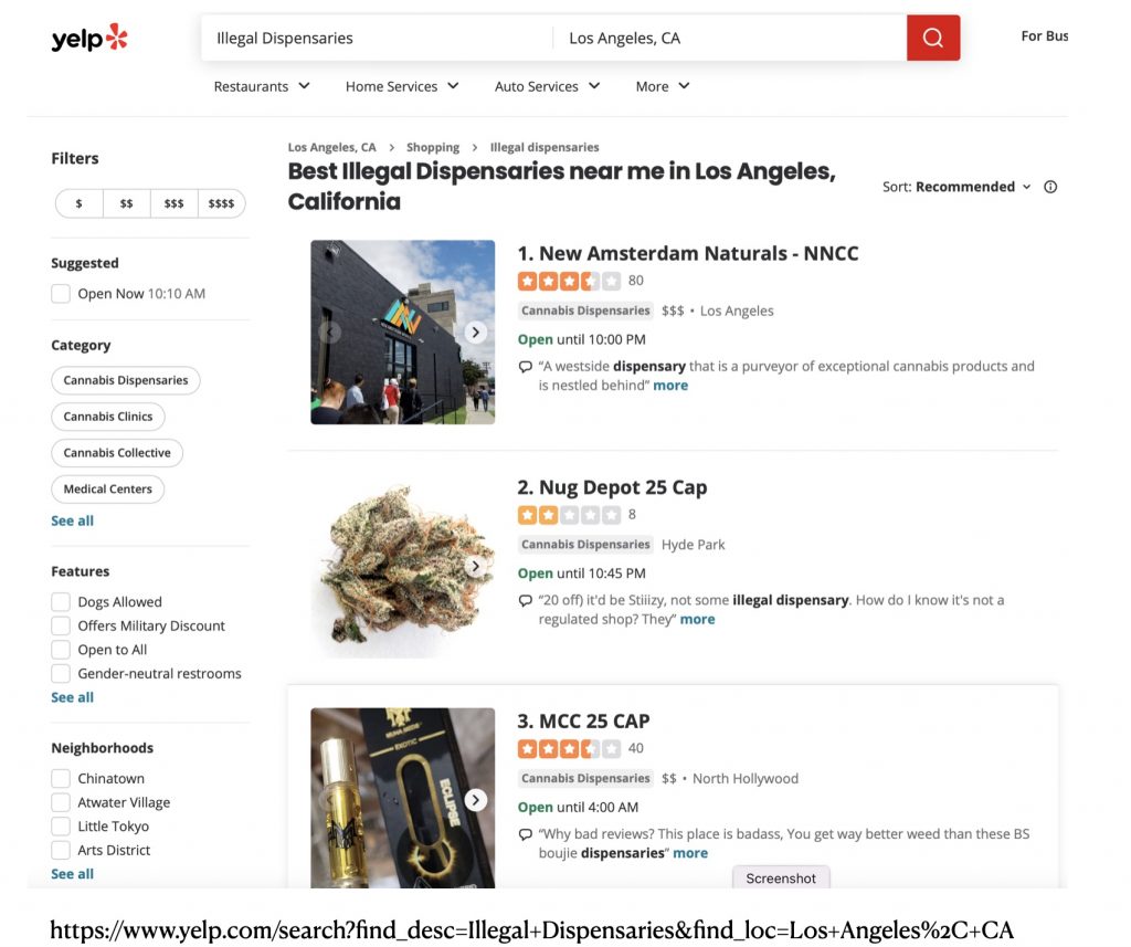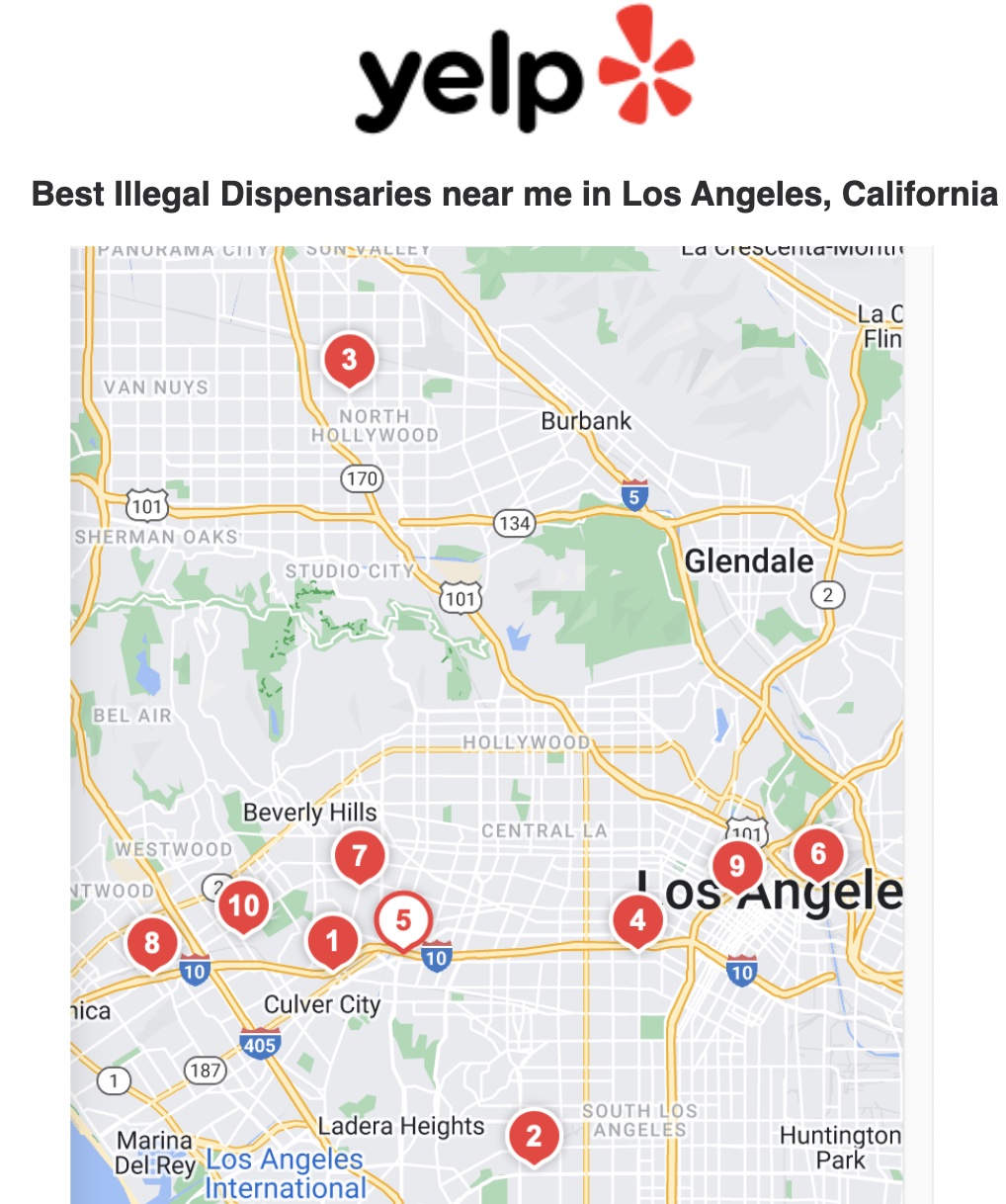 Unlicensed dispensaries are so widely tolerated that Yelp has a page listing the “best illegal cannabis dispensaries near me.” (I cannot say, however, whether the dispensaries listed here are truly illegal.) For several years, the important cannabis website Weedmaps also listed unlicensed dispensaries, although that is no longer the case. If one wants to avoid patronizing illicit operations, the maps provided by Weedmaps are a good place to turn.